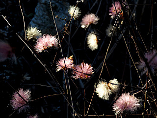 | 送電線鉄塔から見上げる物見山 | シデコブシが咲く前でまだ荒れ気味の糀湿地 | コウヤボウキの実が目立つ |