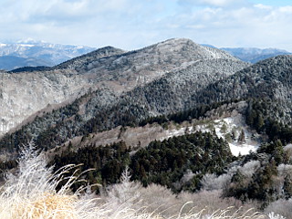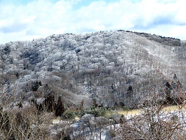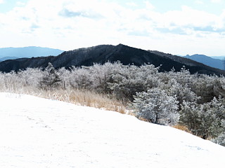 | 井山から見る1200高地 | 井山から見る霧氷で覆われた天狗棚 | |