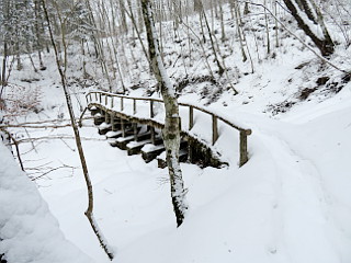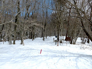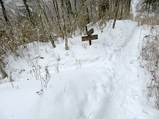 | 面ノ木第一園地への下降点 | 道が見えなくなる程雪が吹き溜まる | 橋も雪がいっぱい |