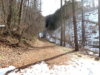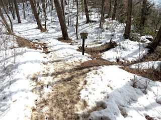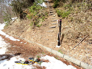 | 大町山岳博物館駐車場 | 鷹狩山登山道入口 | 入口から数十メートルは雪が消えていた |