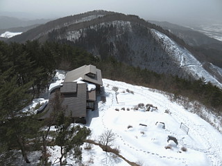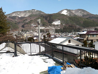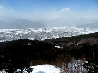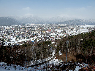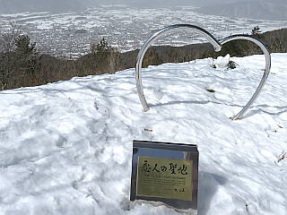 | おおまぴょんの看板が可愛い | 展望台のある鷹狩山山頂 | 恋人のと雪の大町市街 |