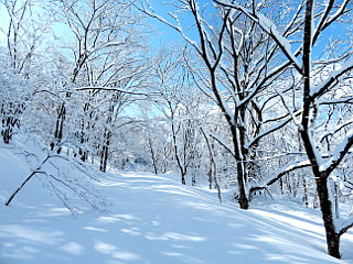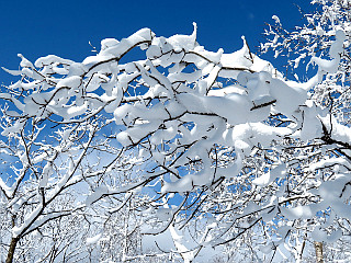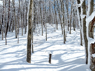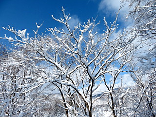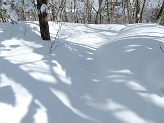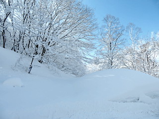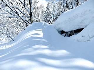 | 山行記 | ●今回、栂池に2泊したのだが、2日目は大雪で山どころではないので、日本海の能生の道の駅へ行ってカニを食べてきた。そして最終日のこの日の天気は曇り予報なので、お約束の落倉浅間山に登っていくことにした。 ●朝、前夜から未明まで降った大雪に埋もれてしまった車の雪下ろしから始める。平日だが栂池高原スキー場へ来る多くの車を見ながら落倉の浅間山登山口を目指す。心配した道の除雪はされていたので無事登山口の駐車スペースまで行くことができた。 ●除雪されている道路から林道へは60〜70cm程段差があるので、まずそれを登るための道を固めてから林道に入る。林道上はスノーシューで30〜50cm程の深さのラッセルで、まだトレースの付いていないふかふか雪の道を進んでいく。 ●頭上の樹木にはこれまで降った雪が積もり、天気が良く青空をバックにとても美しいので、写真を撮りながらゆっくりと進む。雪が多くて元の道が見えないので、たまに深く足がはまってしまうところがある。 ●久しぶりのラッセルで少し疲れたところで、前方にツアー客が登って来るのが見えた。ツアーは林道の起点からではなく、林道の途中から登ってくるらしい。 ●そこまで行けばトレースが期待できるかと思ってそこまで頑張るが、ツアー客は林道をそのまま進まず、斜面をショートカットで登っていったらしい。こちらは林道に沿って歩くつもりなので、またラッセルの始まりだ。 ●木々の雪景色を楽しみながらゆっくりとラッセルと続けると、ツアー客が林道と合流した所に着き、そこからはトレースの上を歩くが、トレースの上を歩くのは格段に楽だ。 ●ところが、北アルプスを望むことのできる展望所で休憩していたツアー客に追いつくと、以降はまたラッセルが始まった。展望所の近くに新しい案内があり、浅間山へのショートカット道が新しく整備されたようなので、それを歩いてみることにした。 ●もちろん、その道もトレースが無いのでラッセルをしながら歩いていくと、ブナの大木広場から来た道との合流点の看板があった。そこからはいつもの道を林道よりも少し深くなった雪をラッセルしながら進む。 ●一旦下ると鳥居のある場所に着くのだが、一昨年上部が無くなっていた鳥居は、二年ぶりに訪れた現在は柱が一本見えるだけになっていた。 ●鳥居のところからは急登が始まる。ここもトレースが無いので登りやすそうなルートを探り、道を作りながら登るが、なかなか時間がかかる。それをなんとか登り切ると、道は平坦になり石垣で囲まれた祠のある浅間山山頂に到着する。 ●もちろんこの雪では祠も石垣すら見ることができず、その辺りが少し窪んでいるので、なんとかそれだとわかる。山頂からは、木々の間から栂池高原スキー場などを見ることができる。 ●時間も昼に近付き、気温が上昇してきたので木々に積もった雪が盛んに落ちるようになってきた。青空も雲が多くなってきて、朝と思うと景色も今一つになって来たので、山頂で少し過ごした後下山にかかる。 ●帰りは、ブナの大木広場経由で帰るが、ツアーは、展望所から林道をブナの大木広場まで登り、その後三角点の方へ向かったようで、再度会うことは無かった。ということで、帰りはトレースの上を快適に下山することができた。 |