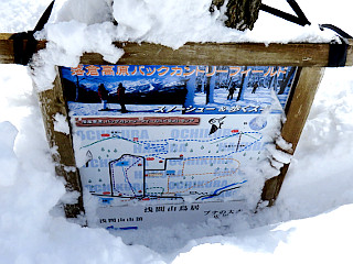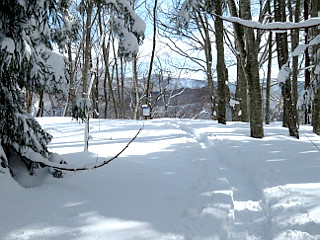 | 展望所から新雪の浅間山へのショートカット道 | ショートカット道とブナの大木広場からの道と合流 | 鳥居の看板も掘り出さないと読めない |