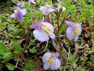 | 山行記 | ●今年の春の花は昨年と比べ遅れているという認識だったが、ネットで見るとここのナンカイイワカガミは少し前に満開状態になっているということで、本来なら24日に訪れる予定だったのが雨で中止になり、結局この日に行くことになった。 ●この日は朝から晴れの予報だったのだが、実際は雲が厚くいつ雨が降ってもおかしくないような感じだ。それでも雨は降らないと信じ、駐車場に着くと早速歩き始める。まずは来た舗装道を少し戻り、案内に従って未舗装の林道に入る。 ●この道は年々荒れてきて、大きな穴ぼこや道端の小低木の枝の張り出しで車が通れる感じではない。道は、橋を渡った所で分岐するが、ここは案内に従って右のコンクリート舗装の急な林道を登っていく。 ●道はコンクリート舗装されているが表面を覆うコケや落ち葉で滑りやすいので油断できない。道沿いにはスルガテンナンショウやイズセンリョウなどの花が目に付く。 ●コンクリート舗装の林道は、広場で終点となり、そこからはよく草の刈られた山道を登っていく。並走する川は、近年の大雨や台風などのため、倒木や土砂が堆積し荒れた感じだ。道はしだいに傾斜を増し、やがて舗装された林道に出る。 ●林道を横切ると、対岸から再び山道に入る。前年までは荒れて不安定だった入口の部分は歩きやすく整備されていた。道は徐々に急になり、急な斜面をジグザグに登るようになる。それを登り切ると稜線分岐に出るが、そこには何の標識も無い。 ●ここは風頭山を目指して左へ進む。相変わらず厚い雲が垂れ込め薄暗い道をアップダウンしながら進むと岩場に出る。以前はそこから麓の宮崎小学校が見えたのだが、今は木々が伸びてしまって見ることはできない。 ●岩場の辺りから山頂への急な登りが始まり、その辺りからナンカイイワカガミが観られるようになるのだが、既に散り果ててしまったようで咲いている花は見当たらない。昨日の雨で大部分散ってしまったようで、落ちたばかりの花が下に散らばっている。 ●さらに登り、幾つかの群生を確認してみると、上部ではまだ咲いているものも散見されたが、完全に時季を外してしまったようで、最初に予定していた24日に来ることができていたならもう少し見ることができたかもしれない。 ●この急な坂を登り切ったところが風頭山山頂だ。山頂直下の岩場からは南側の展望が開けるはずなのだが、こんな天気なのでガスっていて、自慢の展望も台無しだ。 ●風頭山からは大日山方面へ稜線を進む。風頭山から急坂を下り、以降アップダウンを繰り返しながら進む。途中、幾つも大日山山頂かと間違えるようなピークがあり、それ騙されながら進んでいくと、なんとか三角点のある大日山山頂に到着する。 ●大日山山頂は樹林に囲まれ展望は無い。大日山から少し下り、再び登り返すと「境界見出標103」があり、そこがくらがり渓谷方面への下降点になるのだが、とりあえずはそれを通り越して、すぐ先の662m高地まで行ってみる。 ●662m高地は、本宮山へと縦走する道の通過点で、そこから急な下りになる。周辺にはナンカイイワカガミの小さな群生があり、群生毎に1〜2株程咲いているものを観ることができた。 ●662m高地から先程の「境界見出標103」まで戻り、下降を開始する。薄い踏み跡や赤テープを頼りに慎重に下るが、急な上に滑りやすいので木に掴まり体を確保しながらひたすら下る。 ●急な下りがひたすら続くのかと思うのだが、幾つか急な登り返しもあり、それ以外は全て激下りということで、息を抜く暇が無い。下ること50分余り、ようやく舗装道に下り立つことができる。 ●そこからは、車を置いた駐車場までまだ3km弱歩かなければならないが、道は平坦なので余裕だ。それに加えて、道沿いに咲く花も多いのでそれらを楽しみながらのんびりと歩いていくと、意外に早く駐車場に着くことができる。 |
