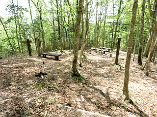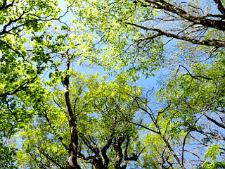 | 天狗棚山頂 | 天狗棚山頂で見上げる新緑の木々 | 1200高地山頂 |