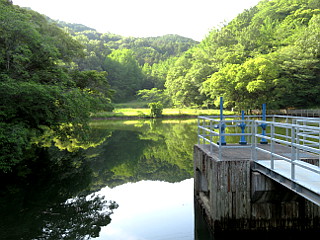 | 県道69号線を渡って舗装道を進む | 新緑を鏡のように映す重川池 | 西登山口 |