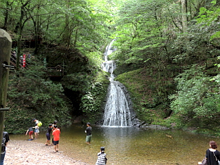 | 家族連れが涼を楽しむ阿寺の七滝 | ||