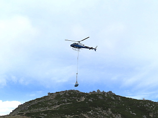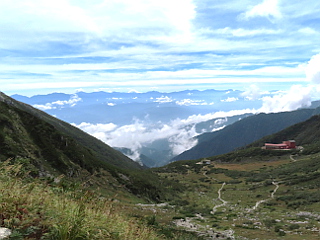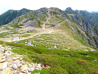 | 八丁坂から見る千畳敷カールと南アルプス | 乗越浄土の山小屋と中岳 | 山小屋の物資を運ぶヘリコプター |