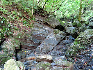 | ゴルジュの中の丸木を渡る | 濡れた岩をロープで登る | 林道出合 |