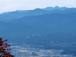 | 狼煙台跡から見る南アルプスの3000m峰群 左から仙丈ヶ岳、北岳、間ノ岳、農鳥岳、塩見岳、荒川岳、赤石岳、聖岳 | ||