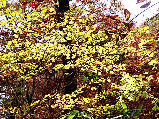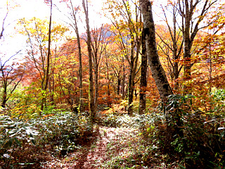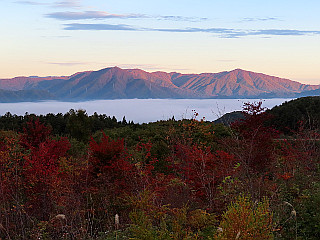 | 山行記 | ●今回は福島県の日本百低山5山を登るための遠征だ。実はこれは9月に企画したものなのだが、天候不良のため延期したもので、今回も直前まで天気予報は思わしくなく、直前まで気をもんだが、何とかなりそうなので実施することにした。 ●前日の午後豊川を出発し、平日なので高速深夜割適用のため夜は那須高原SAで車中泊し、早朝出発して登山口の大内宿奥の小野岳大内登山口駐車場まで車で向かった。 ●途中、道の駅しもごうでは、見事な雲海が見えたので、急遽立ち寄り多くの観光客と一緒にそれを堪能した後、大内宿の奥にある駐車場へ向かった。 ●駐車場は大内宿からさらに車道を進み、途中から未舗装の悪路を登った先にある。駐車場にはまだ一台の車も無く、未舗装でぬかるんだところもあるので、どこに停めようか迷うところだが、適当に車を停めて支度を始めた。 ●登山口から杉の植林帯に踏み込むと、見事な程まっすぐな道を緩やかに登り始める。道は沢の音を聞きながら登るようになり、やがて「小野の泉」と呼ばれる水場に出る。 ●水場を過ぎると道は樹脂製の階段の設置された急坂になり、やがて送電線鉄塔のある尾根上の広場に出る。送電線鉄塔のある所は「天望台」と呼ばれるのだが、「天望」というのがみそで、「展望」ではないらしい。 ●広場からも急な道は続くが、植林からブナやミズナラ、ホウなどの落葉樹林に代わり、道にはホウの落ち葉が目立ち、赤いホウの実もよく見かけた。 ●1223mのピークを過ぎると道は一旦緩やかになり、周囲の紅葉もいい感じで、樹間には紅葉の山肌や遠くの猪苗代湖や磐梯山なども観ることができた。 ●やがて傾斜が急になってくると小野岳山頂への最後の登りで、それを登り切ると小野岳山頂に到着する。山頂には祠が祀られ、広いが伸びた草で展望は良くない。三角点はそのまま少し進んだところの草むらの中にある。 ●小野岳山頂には地元下郷町の登山記念の看板があり、そこにあるQRコードを読み込んで応募すると記念品を送ってくれるということなので、スマホのメールで応募しておいた。 ●山頂でしばらく過ごした後、下山を始める。下山は来た道を戻り、車に戻ると、せっかくなので大内宿を観ていくことにした。さすがに紅葉シーズンの土曜日の大内宿は、検疫の基準見直しで増加したインバウンドを含む観光客で溢れていた。 ●大内宿はそば屋が多いので、葱の強烈な辛さに耐えながら名物の葱そばを頂き、家並みを散策した後、会津若松のホテルへ向かった。ホテルへ向かう途中、清酒「花春」の蔵元を見つけたので立ち寄ってみた。運転なので試飲はできないが、せっかくなので酒を購入することにした。 |
