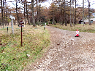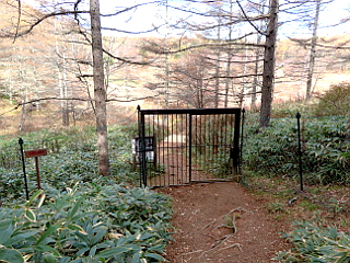 | 紅葉の中を緩やかに登る | 法華道分岐 | 入笠湿原入口の獣除けの扉 |