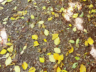 | カクレミノの黄葉の落ち葉が目立つ | 赤松山山頂 | 紅葉したドウダンツツジ |