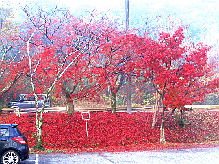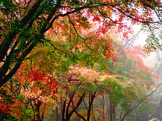 | 定光寺公園第1駐車場のモミジ | 霧に包まれた正伝池 | 正伝池畔の四季桜 |
