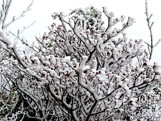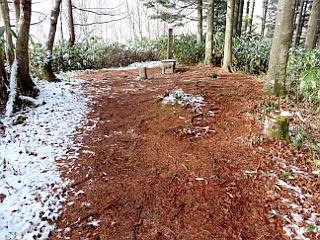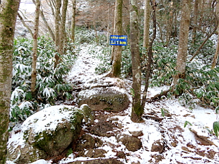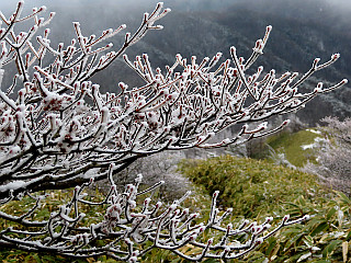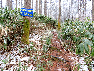 | 山行記 | ●大川入山山頂直下では、初冬にササの斜面にポツポツと生えている木々に霧氷が付き、その様子が牧草地に放牧された白い羊の群に見えるという。この現象は、雪が積もる前の冷え込んだ日にしか観られないようだ。 ●以前から気になっていたのだが、その気象条件が整わなければ観られないので、機会をうかがっていたところだ。そして、数日前、ネットにそれが観られたという情報があり、この日が晴れの予報で、しかも冷え込むということなので出掛けることにした。 ●急に決めたので、少し遅れ気味で豊川を出ることになってしまったが、車を停める治部坂高原駐車場には9時前に到着することができた。治部坂高原駐車場は、平日ということもありまだ数台の車しか停まっていなかった。 ●早速支度を終えると出発する。いつもはここから蛇垰山へ登ることが多いのだが、この日は国道を横断し、舗装道を歩いて大川入山の登山口を目指した。意外に急な舗装道は、カラマツなどの落葉で覆われていてふかふかだ。 ●すぐに舗装道はT時路に突き当たり、そこから案内に従って右に少し下った所が大川入山の登山道入口だ。登山口からは、水路の縁石の跡が残る急な道を登り、水道施設跡を過ぎてさらに進むと、一旦緩やかに下り鉄製の橋を渡る。 ●橋からはジグザグに急斜面を登るようになり、それを登り切ると尾根に出る。そこからもヒノキなどの根が地面を覆う急坂が始まる。歩き辛い薄く雪の積もる木の根の道はしばらく続き、それが落ち着くと横岳山頂に到着する。 ●横岳を越えると小さなアップダウンのある道をひたすら進む。樹相も植林から雑木林に代わり、時折周囲が開けるが、ガスに覆われ、細かい雪も降り始めてお目当ての白い羊の群を見ることができるのかが心配になってくる。 ●途中で「大川入山山頂まであとおよそ2km」の案内を過ぎると少し大きめのピークを越えて大きく下り、「大川入山山頂まであとおよそ1km」の案内を見ると、いよいよ大川入山への登りが始まる。 ●周辺の木々は霧氷を纏い、時折青空も現れ始める。山頂が近付き、ササの斜面を見ながら登るようになると、いよいよササの斜面に浮かぶように霧氷を纏った木々が見えてくるが、これがこの日の目的の「白い羊の群」だ。 ●ガスがかかったり日が当たってきたりで目まぐるしいが、白い羊の群をカメラに収めようとしばらく粘り、それでも、気温が低く風もあって寒いので、続きは帰りのお楽しみということにして山頂へ続く残りの急坂を登って大川入山山頂に立った。 ●大川入山山頂は終始ガスに覆われ、自慢の展望も台無しだ。ベンチにも雪が積もり、とにかく風が冷たいので、風の無い場所で少し過ごした後、早々に下山を始めた。 ●先程の白い羊の群が見える場所に着くと、先程より少しは青空が見え日が差してきたりと条件が良くなってきたので。またしばらく粘ることにした。そこからは、白い羊さん以外にも霧氷の木々の向こうに蛇峠山や長者峰、茶臼山なども見ることができた。 ●結局そこで30分近く粘った後、来た長い道のりを戻った。往きに見られた道沿いの木々の霧氷やササの葉に積もっていた雪などはすっかり消えていた。 |