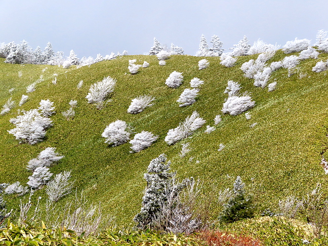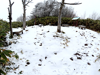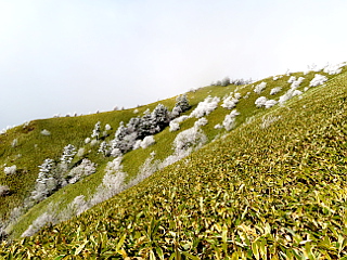 | 山頂直下のササの斜面と霧氷の木々 | 大川入山直下から見る蛇峠山とまだ雪の無い治部坂高原スキー場 | |