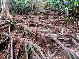 | 木の根の張り出した登山道(帰路撮影) | 横岳山頂 | 大川入山山頂まであとおよそ2kmの案内 |