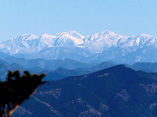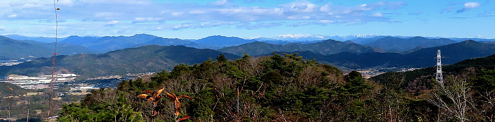 | 五葉城址から見る奥三河の山々と南アルプス、富士山などのパノラマ | ||