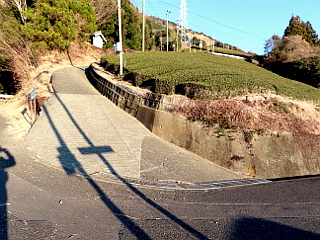 | 茶畑最上部の岳山登山口 | 舗装道出合は岳山登山道入口 | 「茶」の字の真下 |
