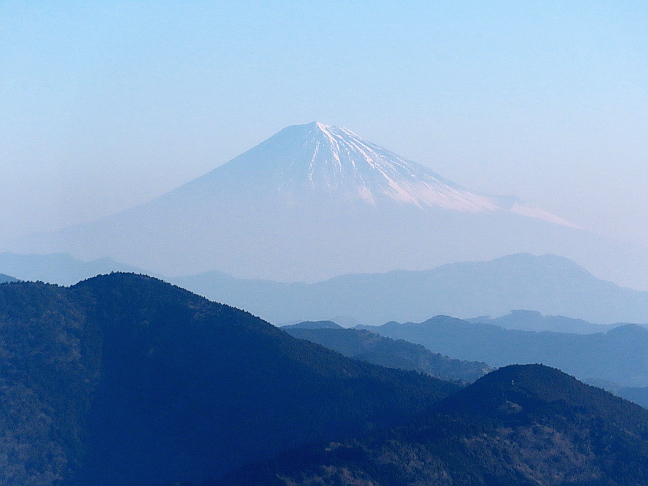 | 山行記 | ●東三河の里山からでも富士山を観ることができるのだが、たまにはもう少し大きく観てみたいと思い、掛川の粟ヶ岳へ行ってみることにした。粟ヶ岳は、山腹に木で書かれた「茶」の字で有名な山だ。 ●この山は富士山を展望することができる山で、以前一度訪れたことがあるが、その時は富士山を観ることができなかったので、今回訪れるのは、そのリベンジの意味もある。 ●この日の天気予報は降水確率0%の晴れで、間違いなく富士山を観ることができそうなのだが、ここ数日、山々がくっきり観えた正月三が日とは違い、遠くが霞んでいたのが気になるが、より近くへ行くことでそれなりに観えるのを期待するだけだ。 ●豊川を未明に出て登山口の東山いっぷく処には7時過ぎに着いたが、三連休の中日ということもあって、何箇所かある駐車場は既にほぼ満杯状態で、それでもなんとか車と車の間の隙間を見つけて駐車することができた。 ●各所の駐車場から次々と出発する登山者に交じってこちらも出発する。最初は車で山頂まで行くことのできる車道を歩く。まだ山頂まで行く車が少ないが注意しながら歩いていくと、分岐があるのでそこからは舗装されたハイキングコースを進む。 ●その先で車道に出るので、それを少し歩いた後、案内に従って傾斜のきつい茶畑の中の道を登るようになる。茶畑の中の道は、分岐が多いが、案内坂が要所要所に設置されているので、迷うことは無い。 ●途中から富士山が観えてくるが、やはり霞んでいて、距離も遠いので大きくは観えない。それでも、青空が素晴らしく、上空を行き来する旅客機が気持ちよさそうに飛んでいる。 ●途中休憩所があるが、土足厳禁なのでパスしてさらに登ると、また車道に出るのでそれを横切って登っていくと樹林帯に入り、御神木や太古の森などを抜けて阿波々神社に着く。粟ヶ岳山頂は阿波々神社を左に回り込んだところにある。 ●粟ヶ岳山頂を確認して阿波々神社の裏手を回っていくと、電波塔が林立する中を抜けて茶草場テラスが現れる。テラスからは富士山はもちろん南アルプスの一部や霞んでいるが麓の街々、大井川、太平洋などを展望することができる。 ●粟ヶ岳山頂まで約一時間、せっかくここまで来て少し物足りないので岳山まで足を伸ばすことにした。粟ヶ岳山頂から舗装道を少し下り、「掛川アルプス登山口」の案内に従って急な斜面を下っていくと舗装道に出る。 ●歩いてきた道の入口には「粟ヶ岳登山道入口」との案内があった。舗装道を少し歩いた所に「岳山登山口」の案内があるのでそれに従って急な山道を登っていくと、最初のピークに「高塚山山頂」の山頂標識があったが樹林に囲まれ展望は無い。 ●高塚山から少し下ると、急な登りが始まりそれを登り切ると松葉の滝方面への分岐が現れ、そこから緩やかに少し下ると電波塔が現れる。再び緩やかな登りに代わると二基の電波塔が現れる。そこから道は左に曲がり緩やかに登った先が岳山山頂だ。 ●岳山山頂には三角点と立派な山頂標識があり、真新しいテーブルとベンチも設置されているが、樹林に囲まれていて展望は無い。それでも、ろくに休憩も無く2時間以上歩いてきたので、そこで少し休憩をしてから下山を始めることにした。 ●下山は、来た道を戻り、先程の松葉の滝方面への分岐を松葉の滝方面へ下ってみることにした。最初は急な下りから始まり、傾斜が緩やかになると小ピークに着く。そこから再び急な下りが始まり、最後には茶畑末端の広場に出るがそこが岳山登山口だ。 ●そこから茶畑の中のコンクリート舗装の道を下っていくと舗装道に出る。舗装道は平坦だがほとんど樹林帯の中で展望は無い。それでも、所々で電波塔が立ち並ぶ粟ヶ岳を望むことができた。 ●林道をひたすら進んでいくと、先程の岳山登山口を経て粟ヶ岳登山口に着くが、そこから粟ヶ岳へは向かわず、さらに舗装道を進むことにした。すぐに東山いっぷく処から粟ヶ岳山頂へ向かう車道と合流する。 ●そこからは山頂へ向かう車や下ってくる車が多くなり、慎重に歩かなければならないが、富士山も観ることができていい感じだ。少し行くと山腹の「茶」の字の真下に出るので、その案内看板も設置されていた。 ●さらに進むと先程登りで通った道に出るので、以降は来た道を戻るが、この時間になって登りや下りの家族連れなどが多くなり、見下ろす茶畑一帯は随分賑やかになってきた。東山いっぷく処まで戻るが、駐車場や頂上へ向かう車道は整理員が立つほど賑やかになっていた。 |