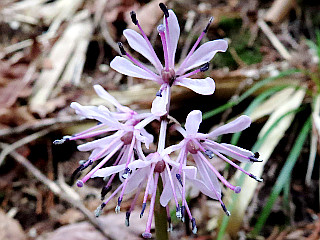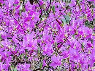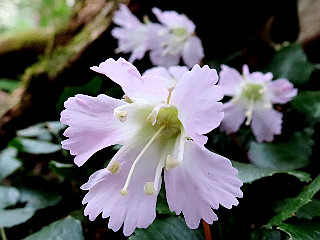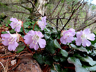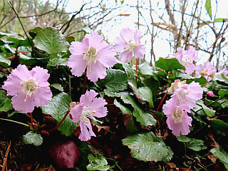 | 山行記 | ●昨年12月に大川入山へ「白い羊さん」に会いに行った時、横岳手前でイワウチワの葉が沢山あるのを見たことから、イワウチワの花が咲く時期に是非訪れてみたいと思っていた。 ●過去のネット上の記事を見ると、5月初旬が見頃になるようなのだが、今年はどこでも春の花の開花が一週間から10日早く、いつもの山仲間との山行がこの日になったことから、この日の行先を横岳にすることにした。 ●少し早いかと思ったが、朝6時に集合出発し、車を停める治部坂高原駐車場を目指す。行く道々では、ヤマフジやヤマブキなどが最盛期を迎えており、山奥に行くにしたがい、地元では既に終わったヤマザクラや新緑が素晴らしかった。 ●長野県に入ると民家や畑に植えられた赤や白のハナモモがいい感じで咲いており、サクラやミツバツツジ、芽吹いたばかりの淡い緑のカラマツなどが入り混じってとても美しかった。 ●この日は、直前に、数日前からの雨予報がら曇りの予報に代わったのだが、数日前の暑さから一転して寒く、近くの気温表示は5度を示していた。 ●平日ということもあり、一台の車も停まっていない治部坂高原駐車場に車を停めると早速歩き始める。まずは、国道を渡り対岸の舗装道を進むが、意外と急傾斜なので、すでに登山道が始まっている感じだ。 ●やがて、大川入山登山道と書かれた木の標柱が現れる。そこから縁石だけが残った荒れた急な林道をしばらく登る。途中水道施設のフェンスに沿って90度道が曲がり、その後少し下ると橋が現れる。 ●橋を渡ると急なジグザグの登りに代わり、それを登り切ると尾根筋に出る。尾根道は無数の木の根が覆う歩き難い道で、傾斜もあるので少しでも歩きやすい所を探しながら登っていく。 ●途中からこの日の目的であるイワカガミの葉が観られるようになるが、咲いている花は疎らだ。それでも登っていくに従い花数も多くなってきていい感じだ。木の根の道が終わると道は緩急しながら続く。 ●この日は歩き始めから雨が降りそうな暑い雲に覆われていたが、いつの間にか気にならない程だが細かい雨が落ち始めた。今回のコースはほとんどが樹林帯の中で、行程も短いので気にしないで先に進んだ。 ●最後の急登の後、タチツボスミレが群生する緩やかな道を登っていくと、やがて樹林に囲まれた横岳山頂に着く。山頂には三角点があり、ベンチが整備されているのでしばらく休憩をした後下山は来た道を戻った。 |