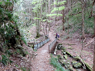 | 一台も車の無い治部坂高原駐車場 | 大川入山登山道入口 | 橋を渡って尾根への急登に取り付く |