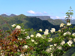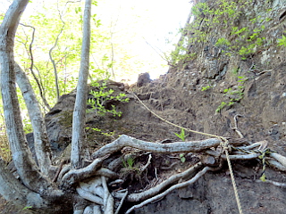 | 駐車場から観る滝のように咲くヤマフジの花 | 鹿岳登山口 | 鹿岳のコル直下のクサリ場 |