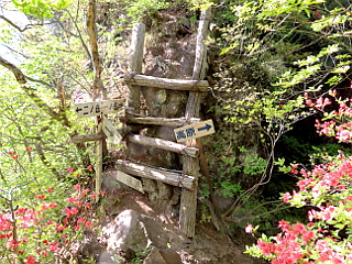 | 鹿岳のコル | 木の階段を上ると次はクサリ場が待っている | 二ノ岳山頂直下から観る一ノ岳 |