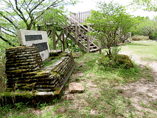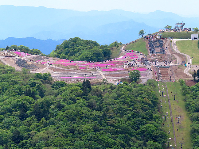 | 茶臼山山頂から見る芝桜まつりで賑わう萩太郎山の花壇 | 野外活動ロッジ跡、森の広場分岐 | |