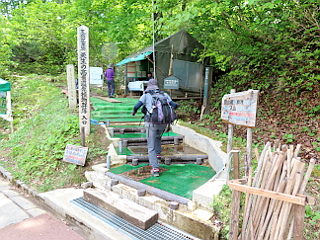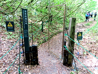 | 上から見る天生峠駐車場 | 靴を洗浄して湿原へ踏み入る | 獣除けの電気柵の出入口 |
