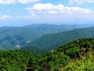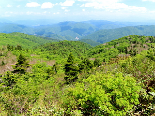 | 籾糠山山頂から見る緑が美しい | 乗鞍岳と御岳が肉眼でかろうじて確認できた | ブナ探勝路のブナの巨木 |