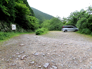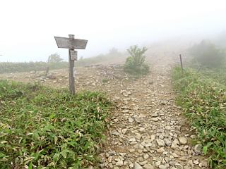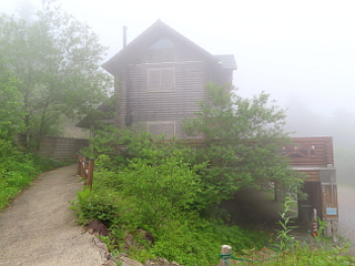 | 一台も車の無い大桧駐車場 | 神坂峠の恵那山登り口 | ガスに包まれた萬岳荘 |