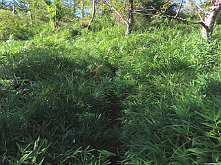 | 朝から暑い比丘尼駐車場 | 愛の鐘 | ササが埋め尽くされたおすすめの小径分岐 |