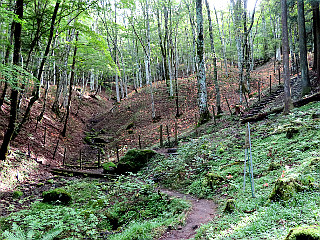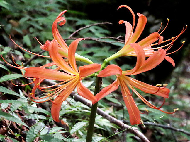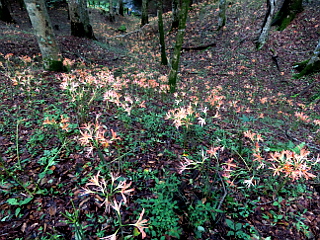 | 山行記 | ●今年もオオキツネノカミソリを観ようと機会をうかがっていたが、そろそろというときに台風7号が日本列島を横断し、一番いい時季を外してしまったようだ。それでも、まだ観ることはできるだろうと、この日行ってみることにした。 ●平日なのだが、世間はまだお盆休みの会社が多いのか、毎日休みの人が多いのか、朝7時半なのだが、既にメインの駐車場は満車で、少し先に道幅が広くなった場所があったのでそこに車を停めることにした。 ●大きな看板のあるオオキツネノカミソリ登山口から沢沿いの道を緩やかに登っていく。このところの雨で、地面は雨水を多くため込んでおり、ぬかるんだ箇所が多い。それでも、多くの人が訪れるようになったおかげなのか、道は歩きやすくなっている。 ●道沿いにはあまり花は観られず、タニタデやミヤマタニソバなどがひっそりと咲いているぐらいだった。作業道に出ると、それを横断して、いよいよオオキツネノカミソリ群生地へ向けて登っていく。 ●少し進むと行く手にオレンジ色の斜面が見えてきた。どうやらまだ見頃は続いているようだ。作業小屋まで進むと、斜面はいい感じにオレンジ色に染まっているが、例年と比べると、時季を外したからなのかやや疎らなような感じだ。 ●それでも多くの人がカメラを持って各所で撮影をしていた。こちらも、画になるポイントを探してしばらく写真撮影を続けた後、獣除けフェンスの出入口を開け閉めして大栗山へ向かう。 ●少し登れば大栗山山頂の表示が現れるが、いつも言うように、そこはピークではない。大栗山からは、案内に従って緩やかなアップダウンをしながら城山方面へ進む。いつの間にか要所要所の指導標も多くなり、迷うことは無い。 ●最後に急な坂を下ると、林道の三差路になる札場峠だ。札場峠からは城山方面へ山道を登る。最初は急な坂もすぐに緩やかになり、後は月ヶ平へ向けて徐々に登っていく。林内にはカエンダケがニョキニョキと生えている。 ●やがて急坂を登り詰めると月ヶ平山頂だ。月ヶ平山頂は三角点があるが、記念写真も撮れない程狭く展望も無い。月ヶ平山頂から急な坂を下り、小さなピークを越えると林道に出るが、それを左に行くと城ヶ山、右に行くとすぐに舗装された林道に出る。 ●後は舗装された林道を右にしばらく歩けばけば札場峠に至る。この日は天気が良く舗装道歩きは暑いかと思っていたが、日陰を選べば以外に涼しく、暑い中にも少し季節が進んでいることを実感した。 ●道沿いには、これまでの年と比べて花が少ないような気がしたが、気候の変化に伴うものなのか、時季的なものなのかはよくわからない。それでも、ミヤマウズラやイチヤクソウの花後なども観ることができた。 ●札場峠からはオオキツネノカミソリ登山口へ続く林道を歩く。ここにも先の大雨の影響か、斜面が崩れ土砂が流出した跡や、舗装道の陥没なども見られた。やがて県道に出ると、車へ戻って帰路に就いた。 ●今年も、オオキツネノカミソリの外に期待していたミヤマウズラやアオフタバランなどは各所で観ることができたが、昨年偶然見かけたハクウンランは、残念ながら今回は見つけることはできなかった。 |