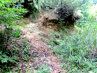| 五葉城址直下の林道から見る平尾山 | 先日の大雨で土砂が流れ出した箇所 | 湖畔道路出合 |