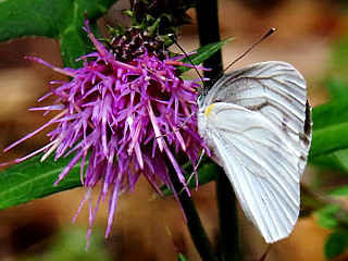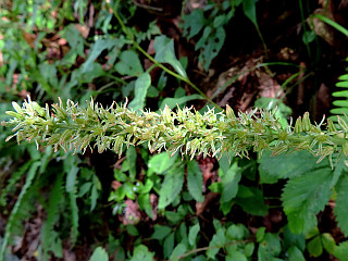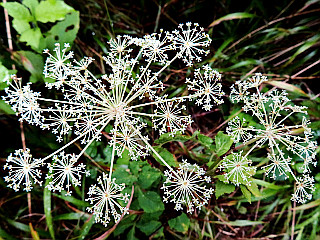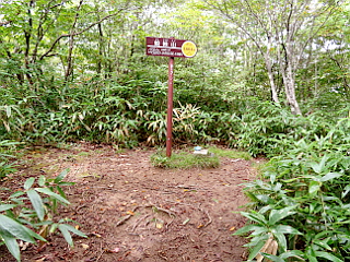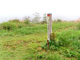 | 山行記 | ●ぐずつく天気が続くといわれていたこの週だが、この日だけ晴れのマークがあったので出掛けることにした。目指す蛇峠山は標高も高く、少しは涼しいだろうし、花も近所の里山とは一味違うのを期待してだ。 ●平日なので治部坂高原駐車場はガラガラで、たった1台停まっていた車もすぐに居なくなってしまった。車を降りると、さすがにここは標高1000m以上あるので涼しい感じで、天気は曇り空だが、しだいに回復してくるということだ。 ●まずは別荘地内の舗装道を歩いて登山口へ向かうが、この間も意外と傾斜があり距離もある。別荘地内の遊歩道入口の看板に従い別荘の間に付けられた山道を登っていくと舗装道に出るが、そこが登山口だ。 ●登山口からすぐに別の登山口から来る道と合流し、さらに登っていく。道沿いではトリカブトやツリフネソウなどが咲いており、アケボノソウも咲き始めていた。道が急になってくると、程無く舗装道に出る。 ●その舗装道を歩き、すぐ先で山道に入る。以降急な坂を登っていくと目の前が開け、一面開けた馬の背に着く。天気は依然どんよりとしていて、ついに霧雨も降り出すぐらいで、一面霧に包まれ、自慢の展望は一切無いので先へ進む。 ●馬の背から一旦下り、駐車場になっている広場にある蛇峠山登山口から山道へ入る。急坂を少し登ると尾根に出て、それをそのまま登っていくと最初の舗装道に出る。以降は短い間隔で舗装道を横断しながら進み、3番めの舗装道からはその舗装道を歩く。 ●相変わらずの曇り空だが、雨は止んだようで、時折日も差してきた。道沿いは花が多く、マツムシソウやウメバチソウ、ヤマハハコ、アキノキリンソウ、ヒヨドリバナなどが咲いていた。 ●舗装道終点には蛇峠レーダ雨量観測所の大きなドームが建ち、狼煙台跡にかけても多くの花が咲いている。それでも一面ガスに覆われていて、狼煙台跡からの展望は望むべくも無かった。 ●仕方が無いので、まずは山頂へ向かう。一旦下って登り返すのだが、その鞍部辺りは濡れたササが深く、ズボンはもちろん上のTシャツまでずぶ濡れになってしまった。 ●蛇峠山山頂には展望台の下に三角点があり、錆が酷くなり危険なため展望台は使用禁止になっているが、使用禁止の黄色いテープは切られていて、これでは上る人も居そうだが、さすがに上るのは止めた方がよさそうだ。 ●山頂からは、狼煙台跡まで戻り休憩をすることにした。天気は徐々に回復してきて、今まで見えなかった大川入山も山頂部は雲がかかっているもののその姿を見ることができ、青空も見え始めていた。 ●もうしばらく待てば展望が開けるのではないかとも思ったが、時間も無いので下山にかかる。下山はいつものように全て林道を歩いて下る。下る途中、数台の登ってくる車に出会ったが、期待した展望が無いからか、皆すぐに下っていった。 ●林道は、濡れていて滑りやすい箇所も多く、気が抜けない。道沿いではツリフネソウやゲンノショウコ、ノギランなどが咲き、ゴマナやハンゴンソウなどが咲き始め、フクオウソウの花芽も多く見かけた。 |