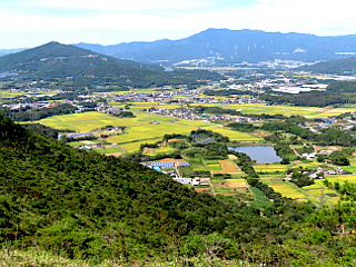 | 正月の稲刈り前のいい色をした田園地帯を見下ろす 秋の花咲く比丘尼と県境稜線 | ||