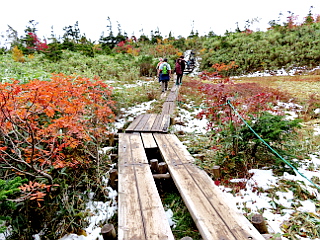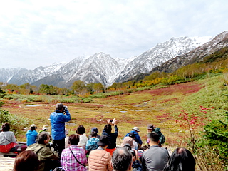 | 山行記 | ●長野二日目は、昨日のような晴れではないが、午前中は天気も持ちそうなので、栂池自然園へ行くことにした。朝、民宿付近からは、昨日とは違い山頂まで見える後立山連峰のモルゲンロートを観ることができ、冴え先がいい。 ●朝食を済ますと、ゴンドラ、ロープウェイを乗り継いで栂池自然園へ向かう。天気は曇りだが、昨日とは違い、後立山の山々は山頂まで見ることができ、栂池自然園一帯では紅葉が始まっていていい感じだ。 ●既に多くの人で賑わう栂池自然園内に入ると木道を歩き始める。この時期これといった花は見当たらないが、山肌の紅葉が冴え、背後には新雪を纏った白馬三山が大迫力で迫り、青空こそないが、写真を撮りながら歩いているとなかなか進まない。 ●ミズバショウ湿原、ワタスゲ湿原と通りながら木道を進み楠川を渡る。楠川からはしだいに傾斜も増し、木道も階段に代わっていく。浮島湿原、銀命水、モウセン池と通り過ぎていくと展望湿原への急な登りを登るようになる。 ●道端のシャーベット状の雪も多くなってきて、傾斜が緩やかになると目的地の展望湿原に到着する。展望湿原にはテラスとベンチが沢山設置されているが、その全てがいっぱいになる程人が多く、立ったまま休憩をとった。 ●展望湿原からは白馬三山を始めとする後立山連峰がずらりと並び、手前には紅葉の湿原が広がっている。欲を言えば、青空があれば、雪山と紅葉と青空の絶好の展望となるのだが、これだけ観ることができれば良しとするしかないだろう。 ●そうしている間にも次々と人が到着し、賑わいが増してくるので、そこそこにして下山を始めることにした。下山はそのまま栂池自然園最高所の展望台方面へ進む。登山者は増々多くなり、行き違いが大変になってきて、時間もかかるようになってきた。 ●展望台からヤセ尾根と呼ばれる急な木の階段を下り、それが落ち着くと細い木道を歩くようになるのだが、登ってくる登山者はどんどん増えてきて、待つ時間は増々長くなってきた。 ●混雑の中、楠川を渡ると、木道も完全に二本になるので一安心。それでも、立ち止まる人や三脚を構える人もいるので、スムーズには進むことができない。後で知ったことだが、この前日テレビの情報番組でここが紹介されていたということだった。 ●異常な混雑状態から逃れるため、栂池自然園を出ると、さっさとロープウェイに乗り下ることにした。この時間になっても、登っていく人は多く、久しぶりに三連休+テレビ放映の恐ろしさを知ることとなった。 |
