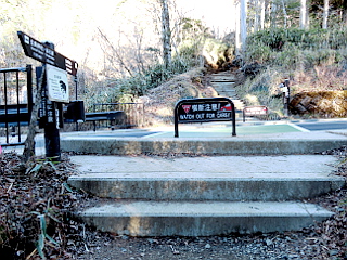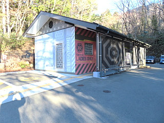 | 登山口駐車場に整備されたお洒落なトイレ | 金時山登山口 | 公時神社社務所前は鶏だらけ |