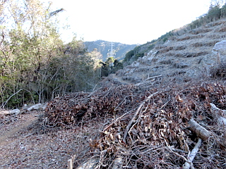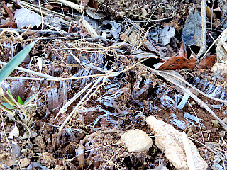 | 広く伐採されたマンサク自生地付近 | 立派な霜柱が立ち上がる | 大知波峠 |