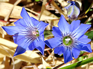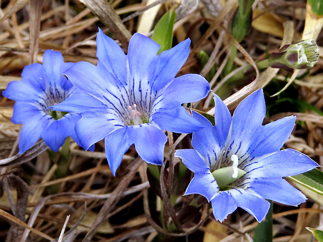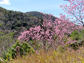 | シュンランやハルリンドウなどが咲く春の花咲く比丘尼と県境稜線 | ||