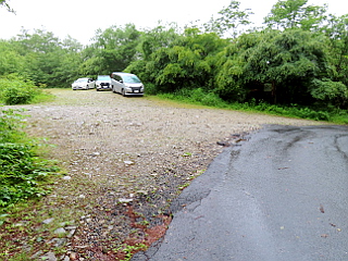 | 雨の降る中大桧駐車場から出発する | 恵那山追分登山口 | 恵那山登山者の車が舗装路に停まっている |