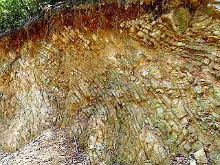| 展望台から観る可児市街と愛岐丘陵 | 電波塔を越えて林道を進む | 褶曲した地層が観られる露頭 |