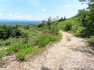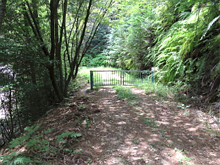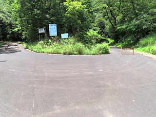 | 明るく開けた林道 | 車止め1 | 怖そうな表示が |