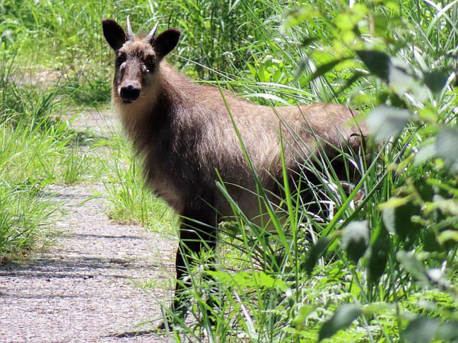 | 山行記 | ●以前、ネットでサクライソウの記事を見つけ、一度行ってみたいと思っていたのだが、このところ開花の情報もあり、ボリューム的にはそれ程無さそうなので、同級生を中心とした山登りの会で行ってみることにした。 ●朝7時に豊川を出て8時半頃には浅間山駐車場まで着くことができた。日曜日ということもあり、混雑を心配したたが、それ程広くない駐車スペースにはまだ一台車が停まっているだけだった。 ●早速支度をして出発だ。そこから浅間神社へ登っていく道がありそれが正解だと思うのだが、ほとんどの登山者が林道をそのまま歩いていくので、そちらが正解だと思ってしまい、少しそれを行ってみることにした。 ●それでも、おかしいと思って地図を見直し、歩いていく人に尋ねてみると、山頂へは先程の浅間神社へ登っていく道が正しく、その人達はウォーキングをしているということだった。 ●ということで、先程の登り口まで戻って登山開始だ。すぐに浅間神社の鳥居が現れ、それを潜って車の通れそうな広い道を登っていく。この時期、花はほとんど無いが、それ程の時間もかからず「浅間神社」の石柱の立つ上の赤い鳥居に着いた。 ●赤い鳥居を過ぎるとすぐに浅間神社の建つ広場に着く。広場には「海抜370M」と書かれたコンクリートの方位盤や山名の書かれたプレートがあるが、ここが山頂ではないようだ。 ●広場から「展望台」という案内に従って薄暗い林内を少し行くと、突然展望が開けるが、どうやらこの辺りが最高点となる浅間山山頂のようだ。そこからは、可児市街や愛岐丘陵などを望むことができた。 ●浅間山山頂からは、そのまま戻ってもいいのだが、それではあまりにも行程が短すぎるので、山頂から東へ続く道を進み、林道を歩いて、先程車を置いた浅間山駐車場まで戻る周回コースをとることにした。 ●道は平坦で、山道と林道がほぼ並行して走っている。山道には赤テープが付けられているので迷うことは無いが、林道を歩いた方が歩きやすい。途中で出会った地元の登山者に道を教えていただき、電波塔を越えてさらに進む。 ●しばらく歩くと開けた伐採地を通る林道が見えてくる。山道は別方向の三角点へ続く道のようなのでそれと別れ、林道を歩くようになる。すぐに車止めのゲートの分岐が現れるので、そこから折り返す方向に林道を進む。 ●その先にも車止めのゲートの分岐があるので、その都度左へ左へと進む。道沿いのウラジロの新葉の重なりが見事だ。やがて大きなな三差路に出るが、ここも左の道を進めば、やがて、車を置いた浅間山駐車場に着く。 ●お目当てのサクライソウは、見ることはできたのだが、時期的なものなのかその数は少なく、心配になる。そのほかにもオオバノトンボソウやノリウツギ、ヤブジラミなど、少ないがこの時期の花を楽しむことができた。 ●また、林道ではニホンカモシカが現れ、しばらくそこで留まりこちらを見ていたので写真に収めることができた。しばらくすると山の中へ消えていったのだが、最初は子連れとは知らず、子供の写真を撮ることができなかったのは痛恨だった。 |