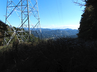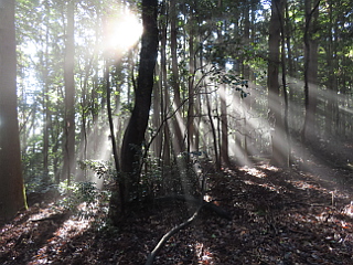 | 薄い霧の樹林帯の光芒が見事 | 送電線鉄塔 | 陣座峠 | |