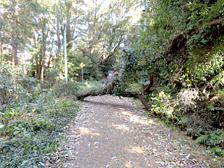 | 昨年の豪雨の土砂崩れの被害に遭った家 | 道を塞ぐ倒木 | 御津山山頂 |