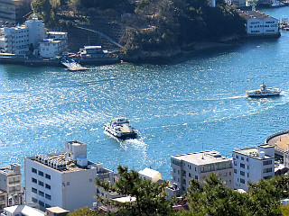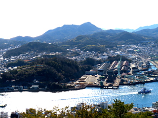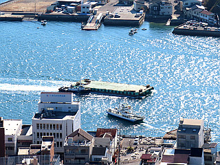 | 展望台から観る福本渡船 | 展望台から観る尾道渡船とタグボートに曳航された台船 | 展望台から観る向島海峡と高見山 |