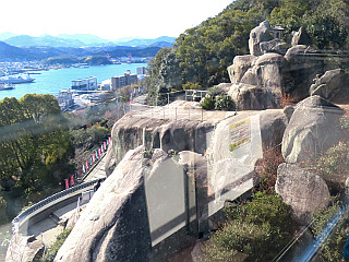 | 山行記 | ●高見山から尾道市街に戻ったが、まだ時間が早いので、予め調べてあった尾道のもう一つの山の千光寺山へも行くことにした。この山も山頂近くに駐車場があるので簡単に登ることができる。 ●ところが、妻がロープウェイに乗りたいと言うが、ロープウェイには駐車場が無いので、麓の有料駐車場に車を停めてロープウェに乗ることにした。尾道は駐車場が少ないので、この日泊まるホテルにも駐車場がないということだった。 ●駐車場から幹線道を渡り、山陽本線を潜るとすぐにロープウェイ乗場がある。ロープウェイは15分おきに運航しているのでそれに乗って山頂へ向かう。乗車時間3分の小型のロープウェイだが眼下に千光寺、背後に向島海峡が観えていい感じだ。 ●山頂駅に着くと、千光寺頂上展望台「PEAK」があり、エレベーターでもループの階段でも登ることができる細長いデッキのお洒落な展望台だ。展望台からは、向島海峡や先程訪れた向島の高見山などを見渡すことができる。 ●向島海峡では、頻繁に往復する2箇所の渡船や、タグボートで曳航された台船や定期船などを観ることができ、飽きることがない。その外、隣の浄土寺山やしまなみ海道の新尾道大橋、遠くは瀬戸内海を往来する船舶を観ることができる。 ●千光寺山山頂の三角点は、展望台横の売店の奥、獣除けの柵の出入り口を開け閉めして進んだお堂の奥の大岩の上に設置されていた。 ●また、ロープウェイで上ってしまうと通ることは無いが、中腹の千光寺は平安時代の始め大同元年(806年)弘法大師の開基とされる古刹で、境内の巨石群や多くの歴史的建造物などの見所が多いとのことだ。 ●途中、石鎚山の岩場のようなクサリの設置された岩場もあるようで、それも興味深く、それは、ロープウェイからでも見ることができる。 ●しばらく千光寺山頂で過ごした後ロープウェイに乗って下った。丁度昼過ぎだったので、かき料理の店で生ガキや海鮮丼などを楽しんだ後、駐車場を探してホテルにチェックインした。 |
