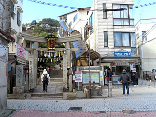 | 展望台から観る尾道海峡を往来する船舶 | ロープウェイから見る石鎚山を模したクサリ場 | 千光寺山ロープウェイ山麓駅と艮神社鳥居 |